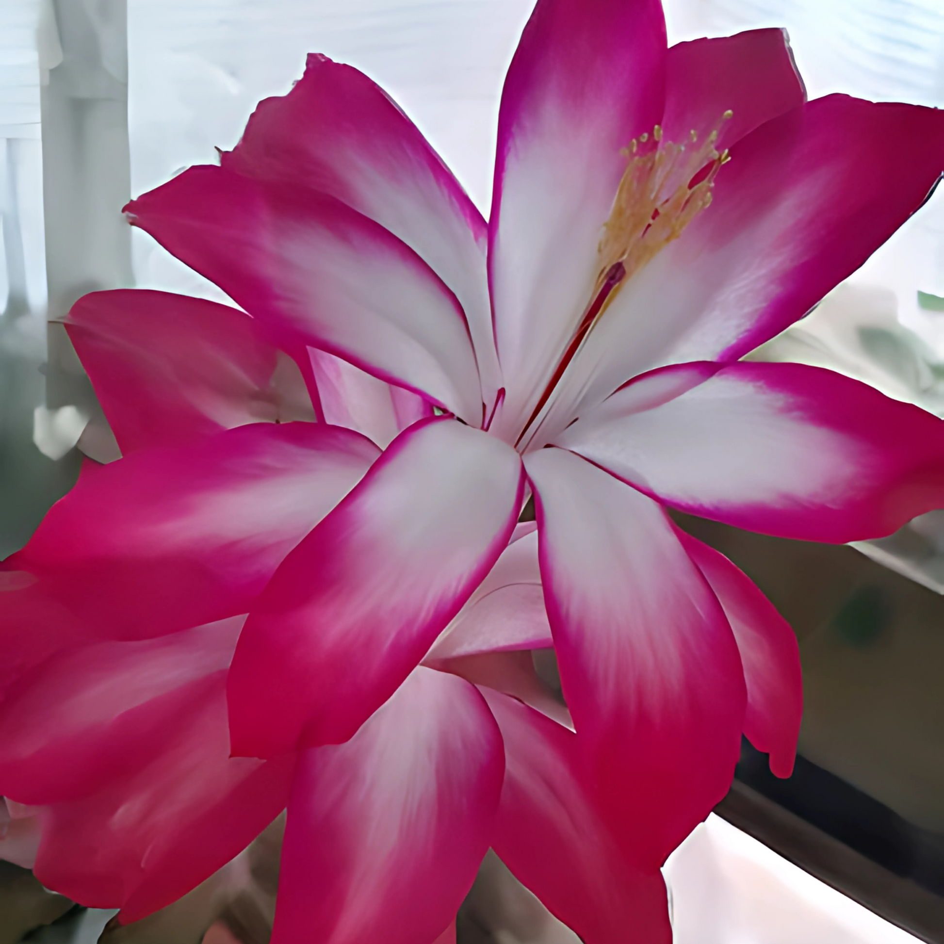 Izzie is a dense growing plant. Flower is clear dark red with white tube and throat. Magenta-red stigma and lobes extend well past white filaments with yellow anthers and pollen.
